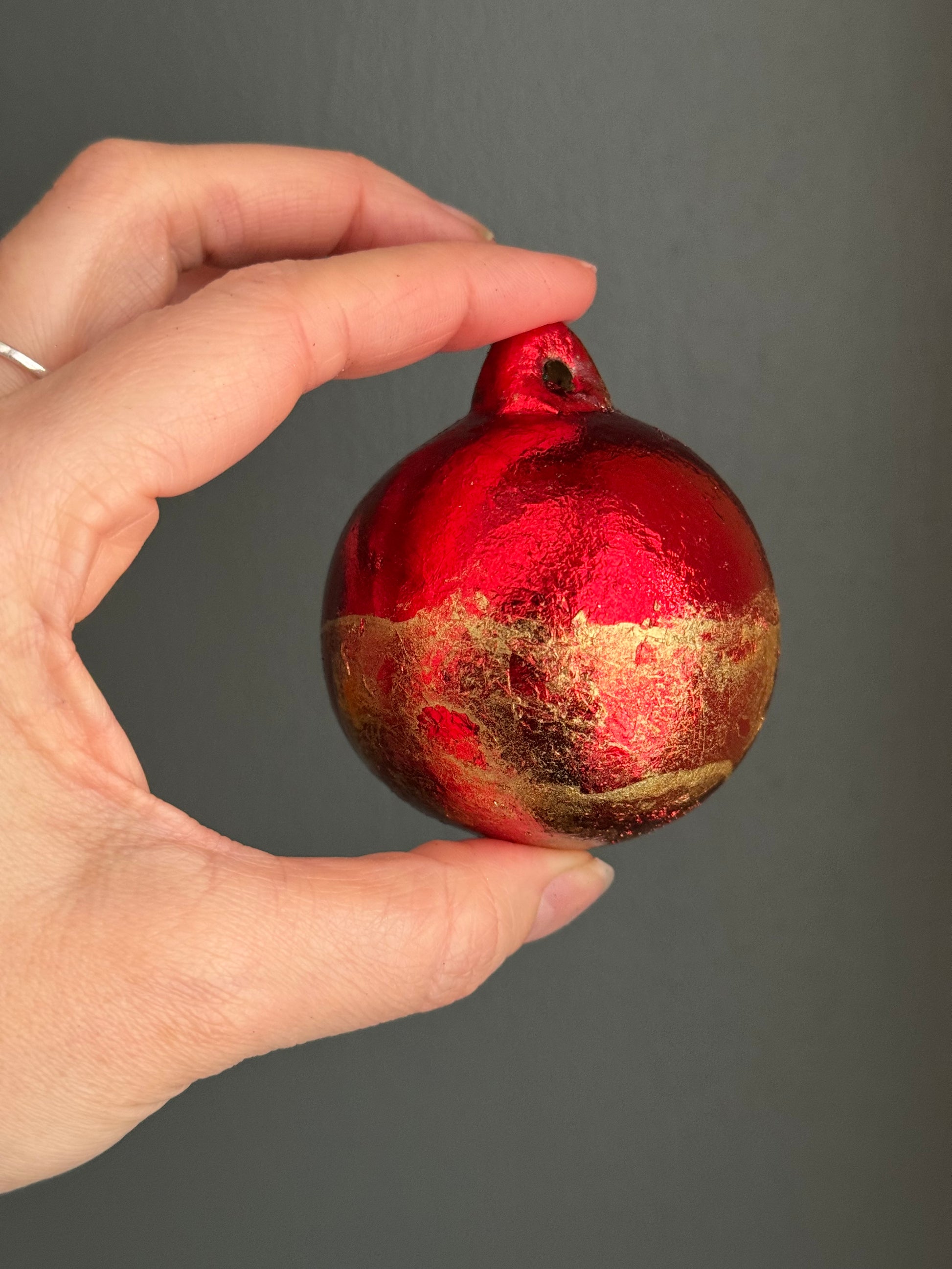Add a distinctive, art-inspired touch to your Christmas tree with this hand-painted ceramic bauble. This bauble uses gold leaf, red foil leaf as well as inks and pigments.