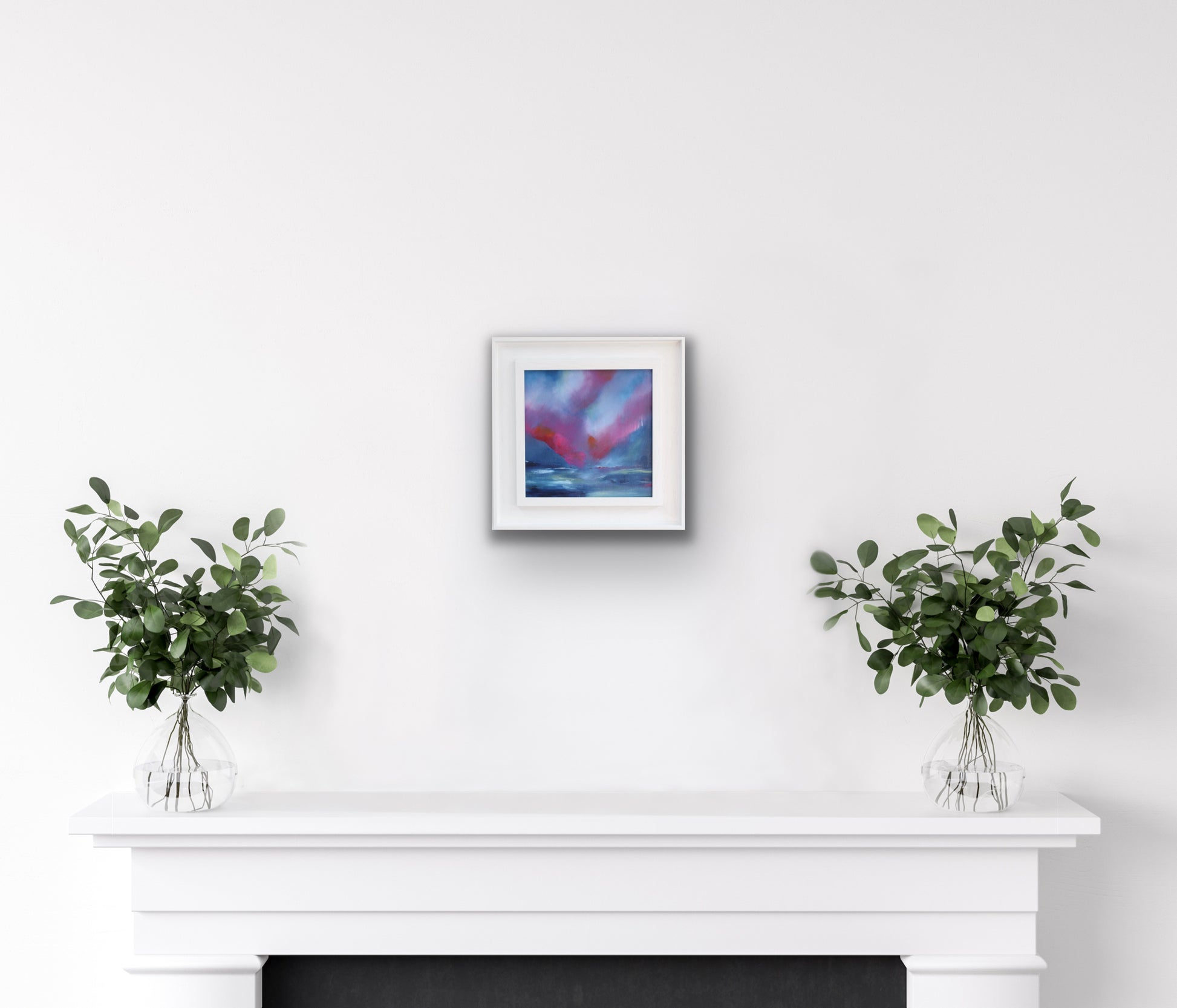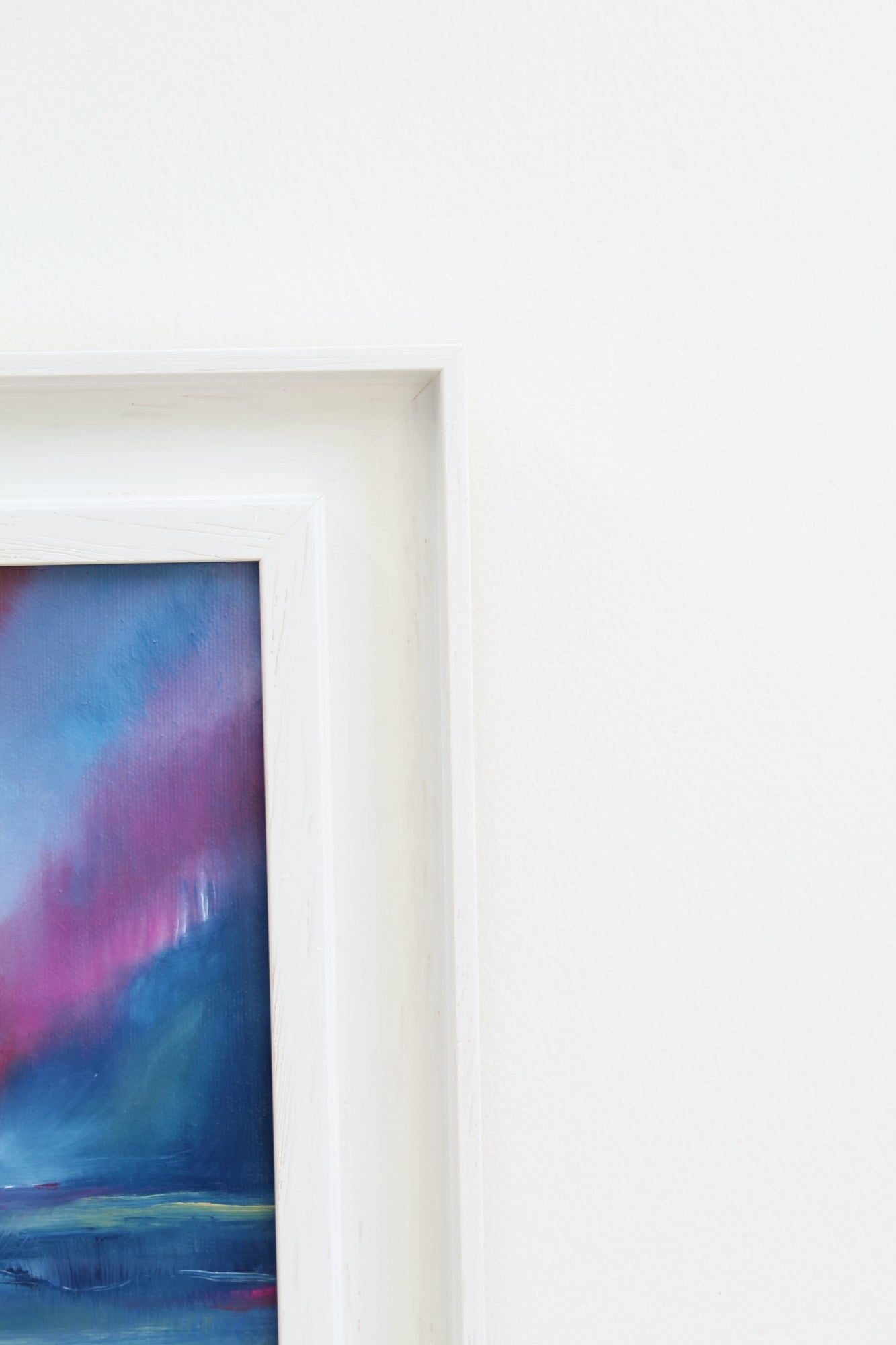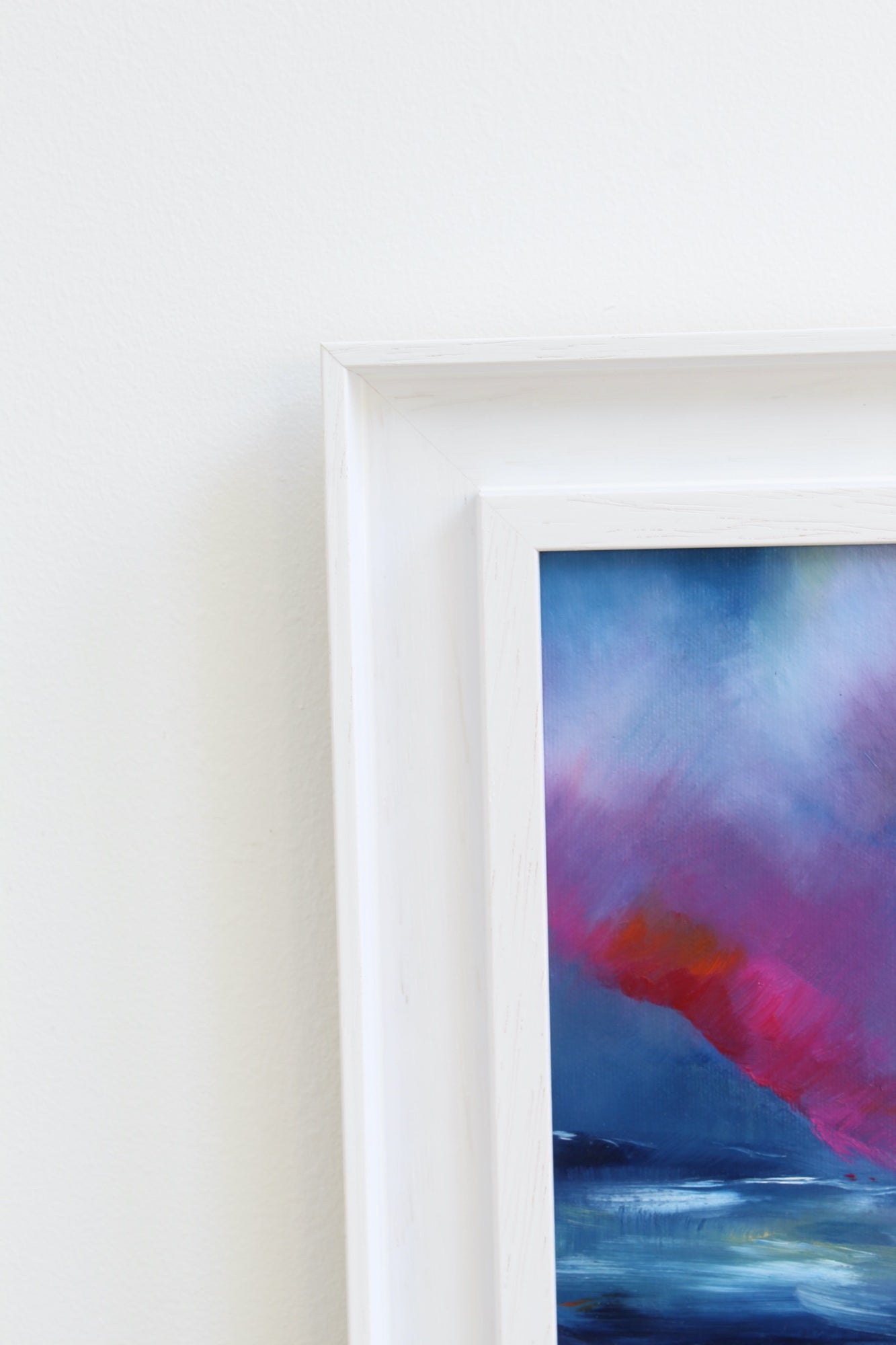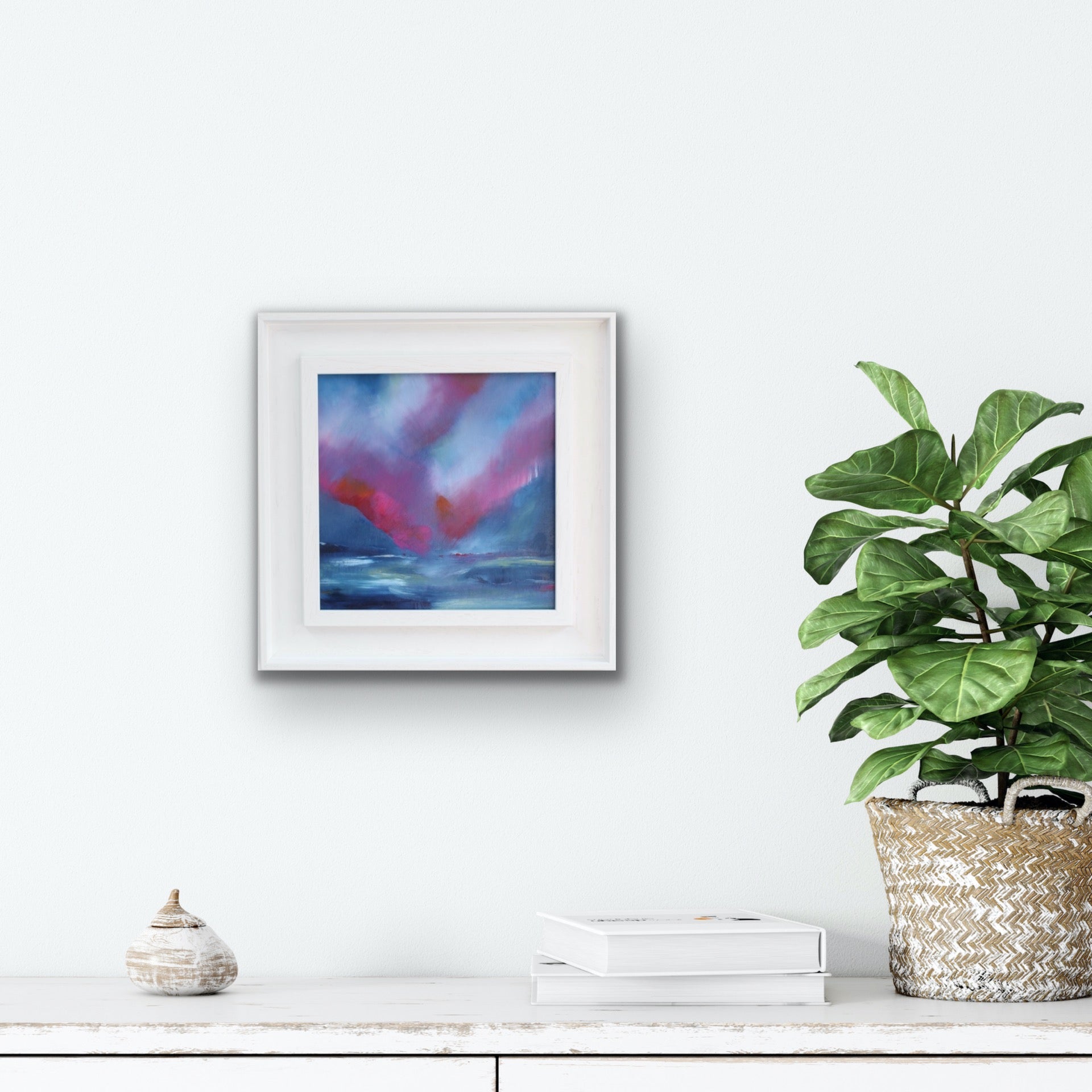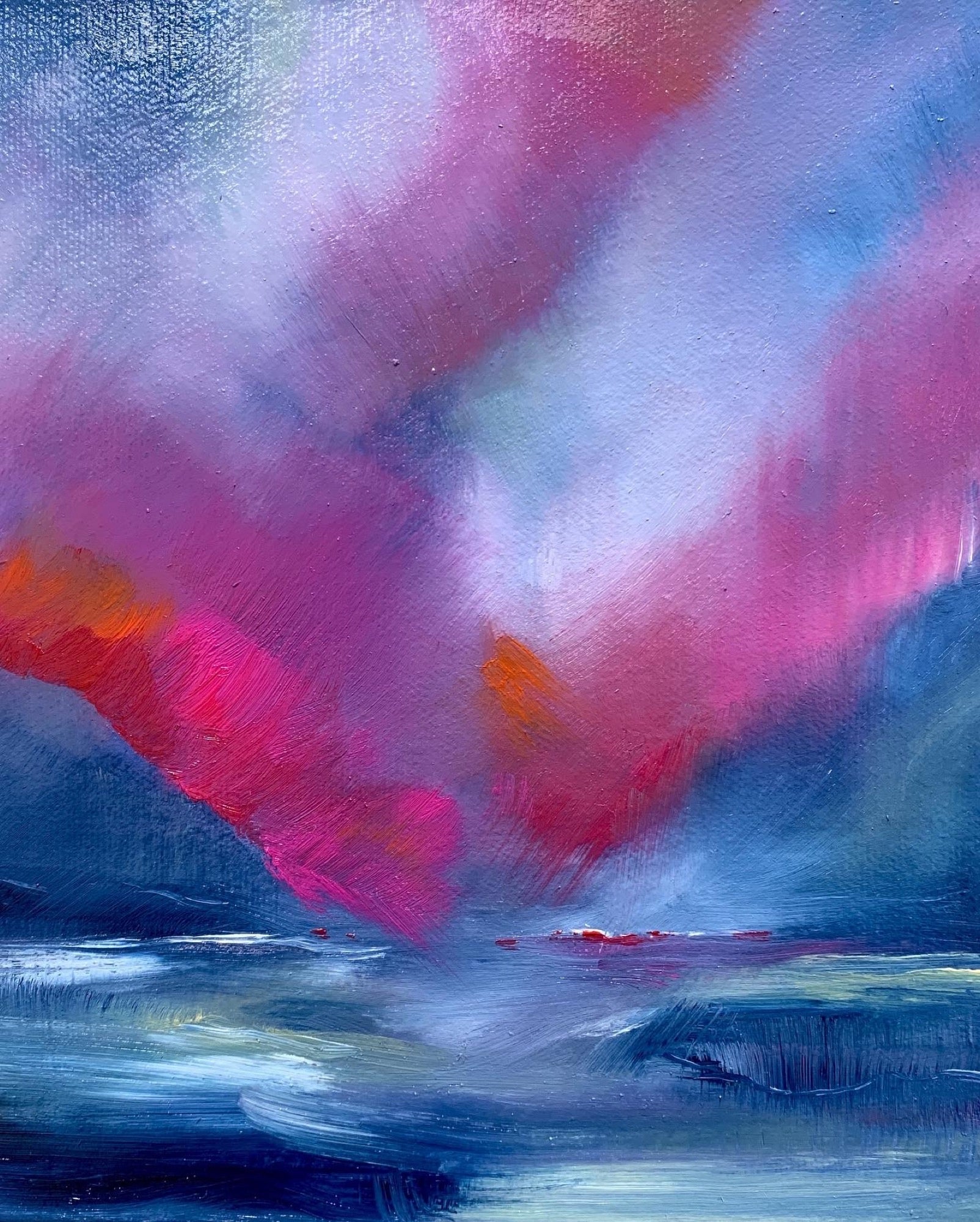 Contemplation, is an oil painting on board and part of the moments collection. Deep blues are punctuated with vibrant pinks and orange. Expressive brush strokes guide the eye towards a horizon that blends away. Movement is paused by lighter highlights allowing contemplation.