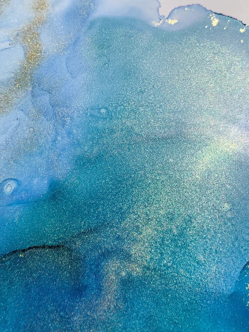 It mimics a slice of a gem stone with shimmering gold and brilliant colour with a mixture of blue, purples, greens and gold.