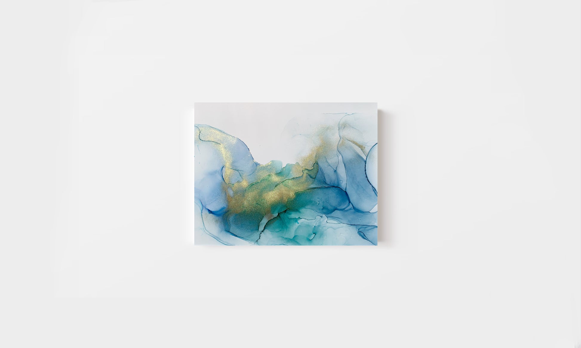 The essence of a tranquil daydream, a visual poem that evokes a sense of peace and wonder. Across the paper, a fusion of blues and teal greens dance, creating a mesmerising tapestry of colour. A gentle wave of gold meanders across the surface, adding a touch of enchantment and intrigue to the composition.