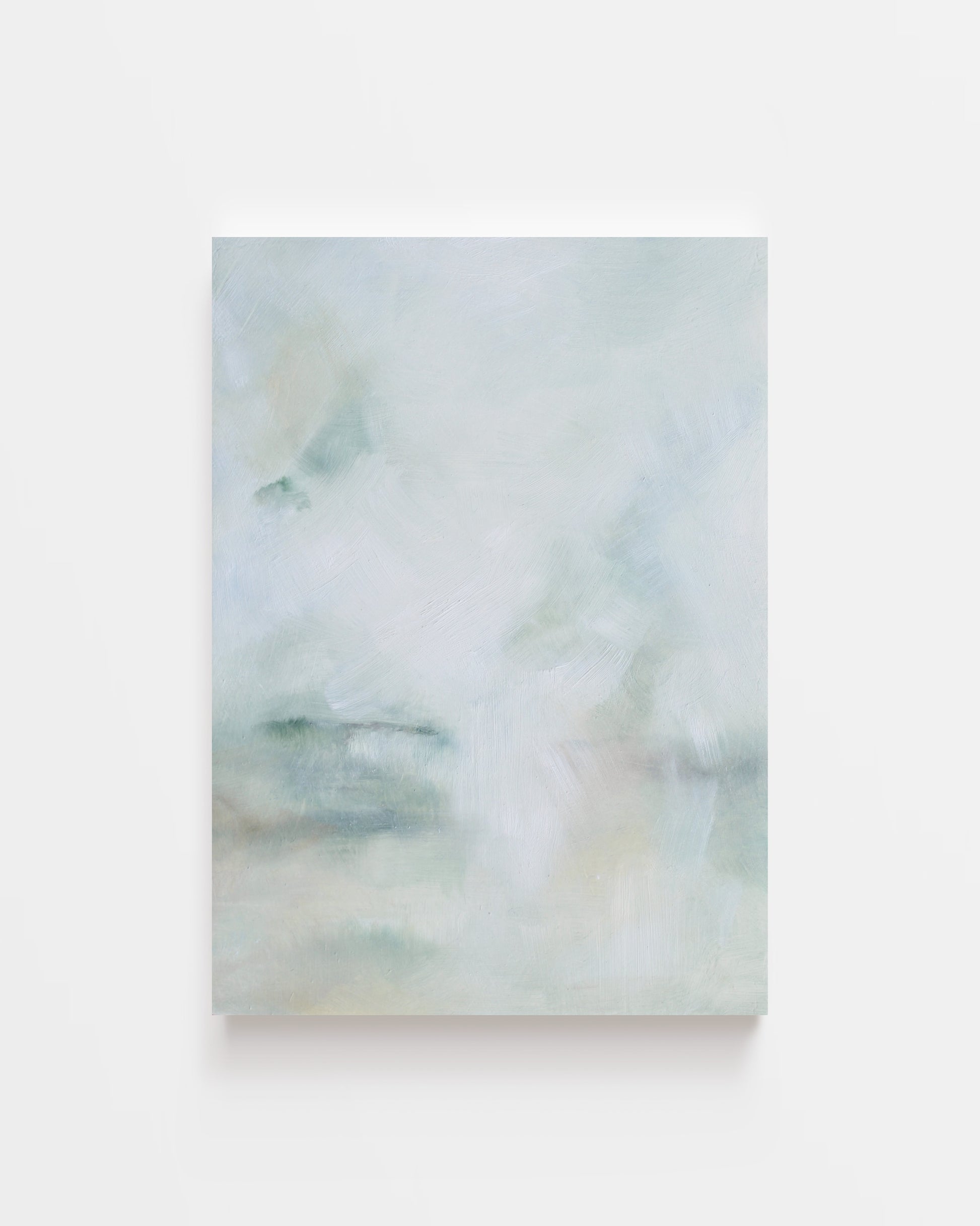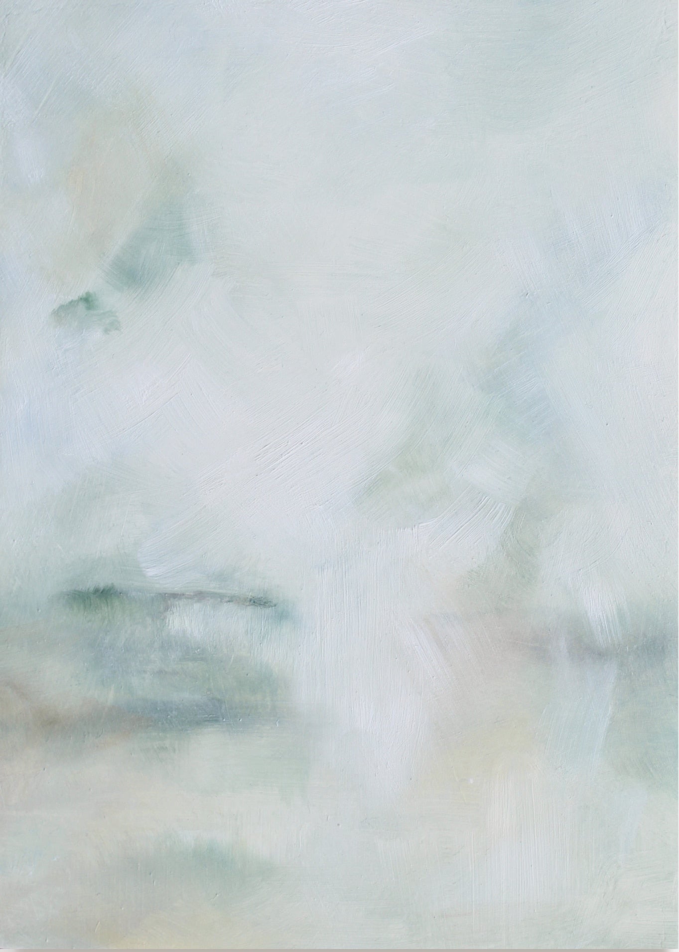 Inspired by a long walk I used to take with my grandmother, across open ground that seemed to stretch on endlessly before the view opened at the edge. That memory now feels hazy, more a sense of space and feeling than clear detail. Soft layered brush marks suggest the sweep of the land and the passing of time. The surface is blurred with white falling loosely from the sky and settling on the horizon, like light, weather, or memory itself descending and dissolving. There's a quiet pull forward, a hint of something waiting just beyond.