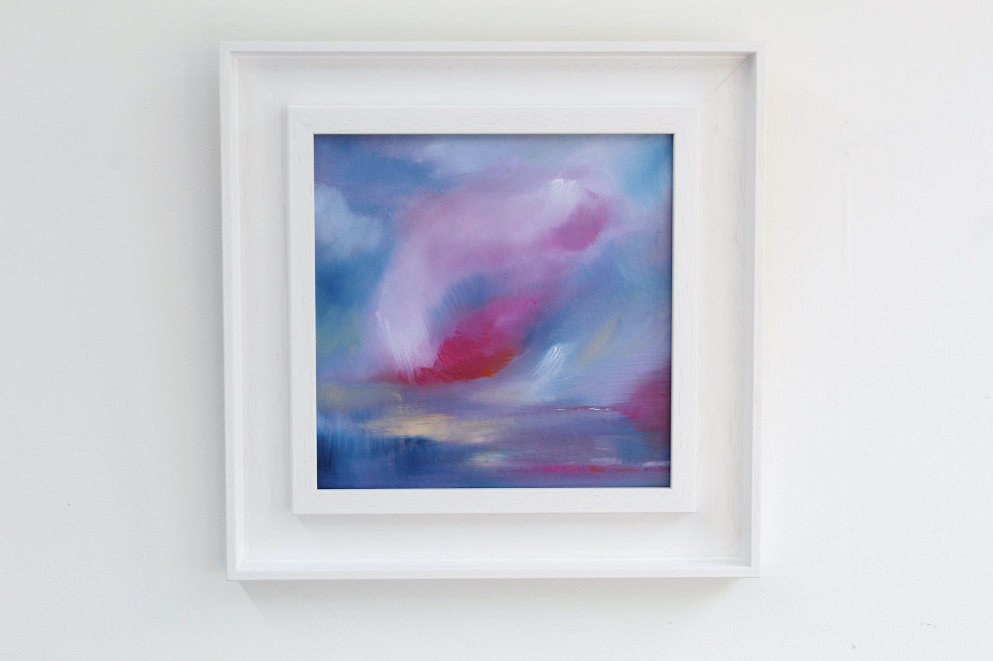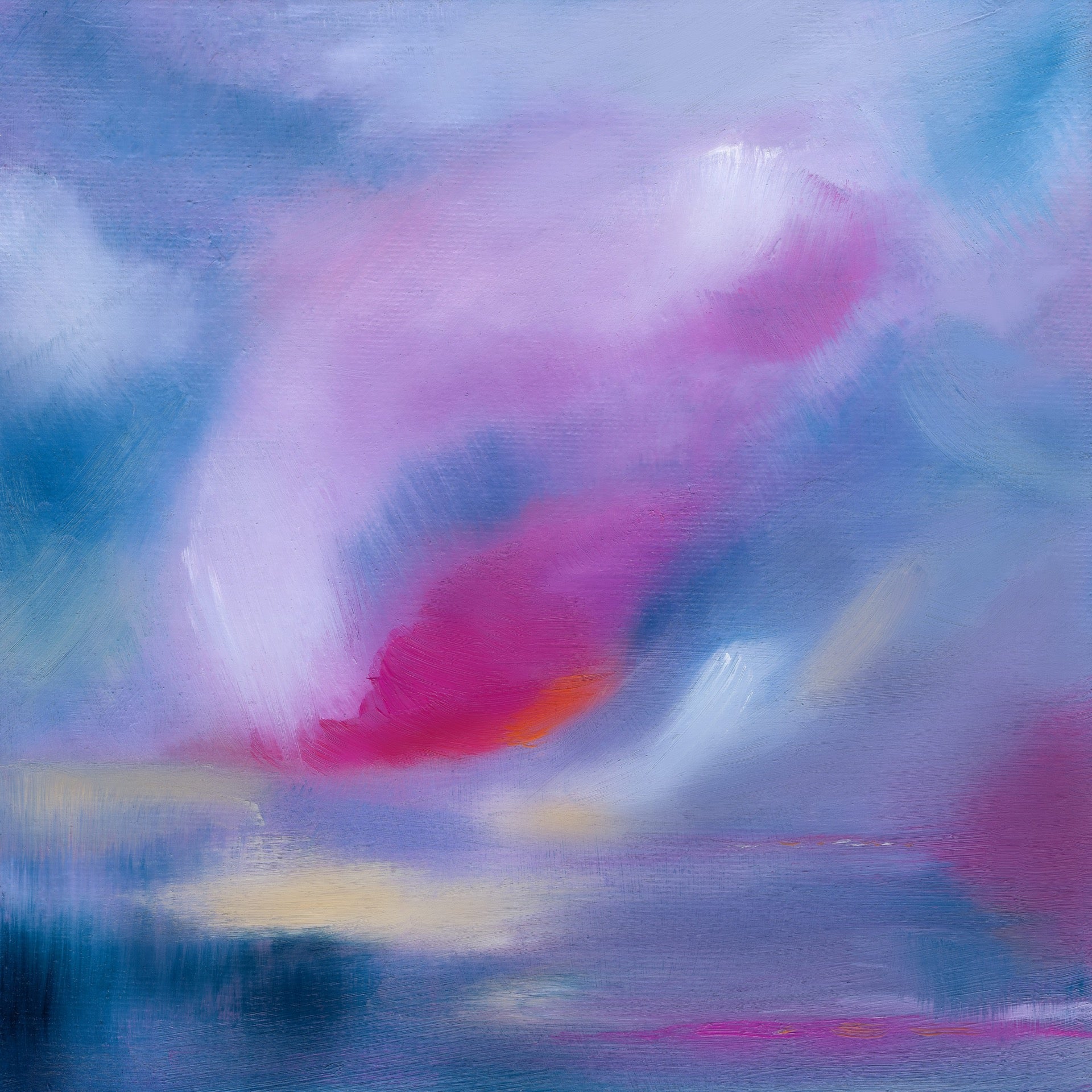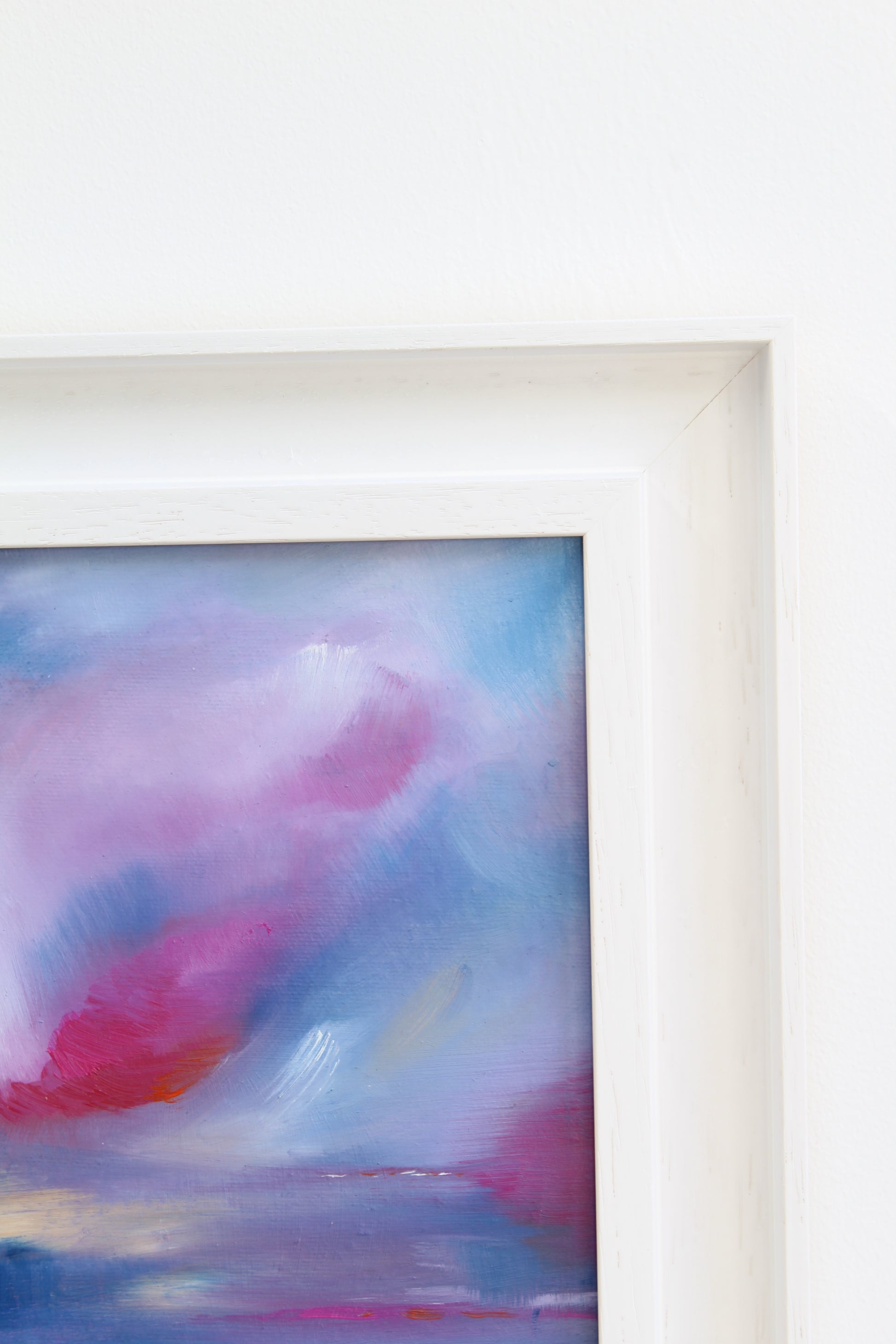 Swathes of pink embrace the painting which is breached by a brush of thick orange paint. Deep indigo blue is partnered with a soothing yellow, like sunlight on water. A horizon is suggested but your eye is drawn to the the movement of brush marks which surge upwards giving a welcome wash of relief.
