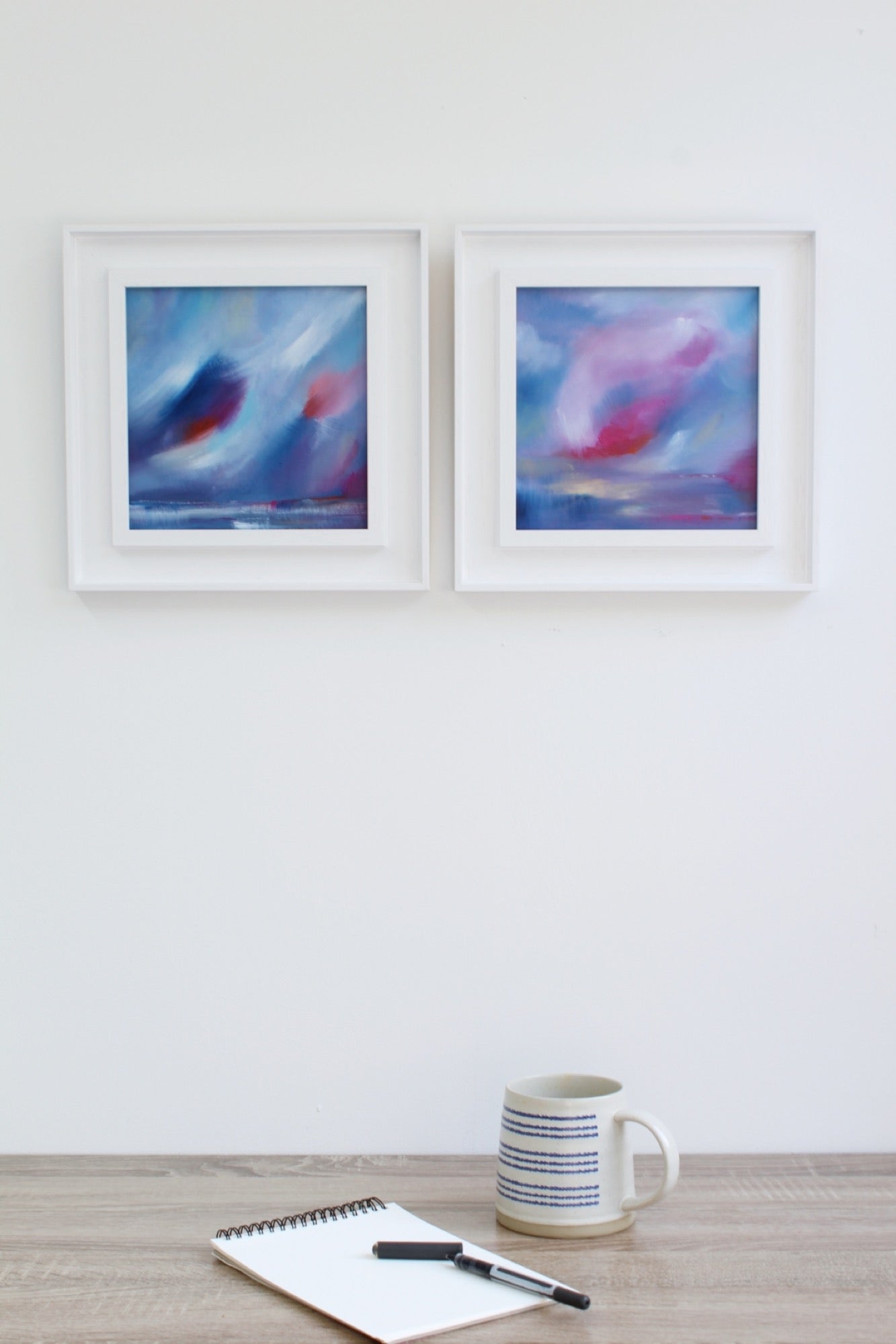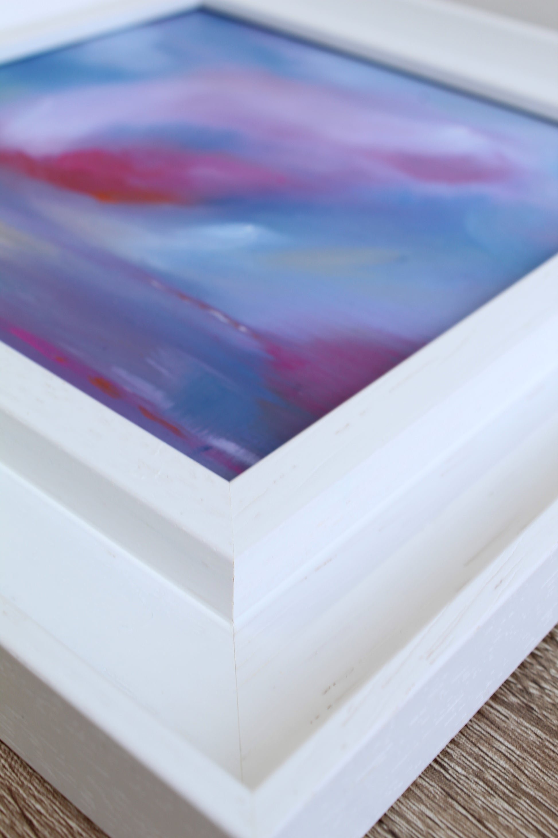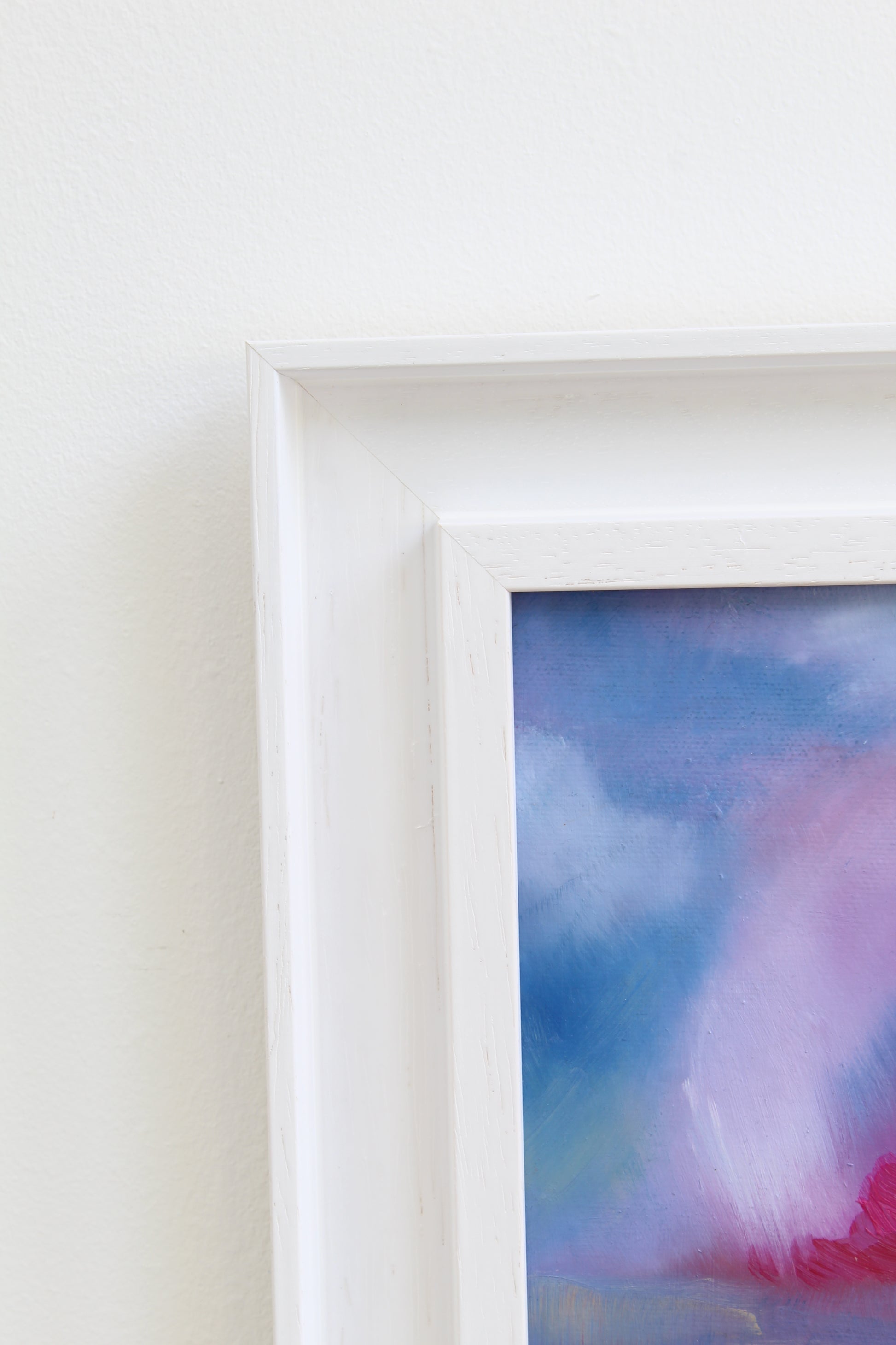 Swathes of pink embrace the painting which is breached by a brush of thick orange paint. Deep indigo blue is partnered with a soothing yellow, like sunlight on water. A horizon is suggested but your eye is drawn to the the movement of brush marks which surge upwards giving a welcome wash of relief.