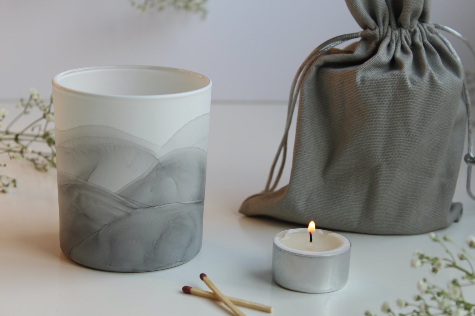 Add a unique touch to your decor with this grey hand-painted pot, crafted by artist Christina Sadler. Each glass holder features a soothing water-inspired design, layered with care to create a truly one-of-a-kind piece. The luxurious matte finish and weighty feel make it both visually striking and tactilely satisfying.
