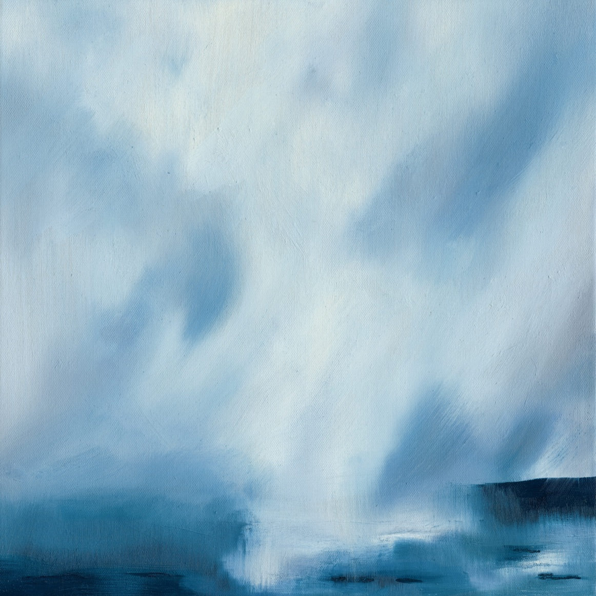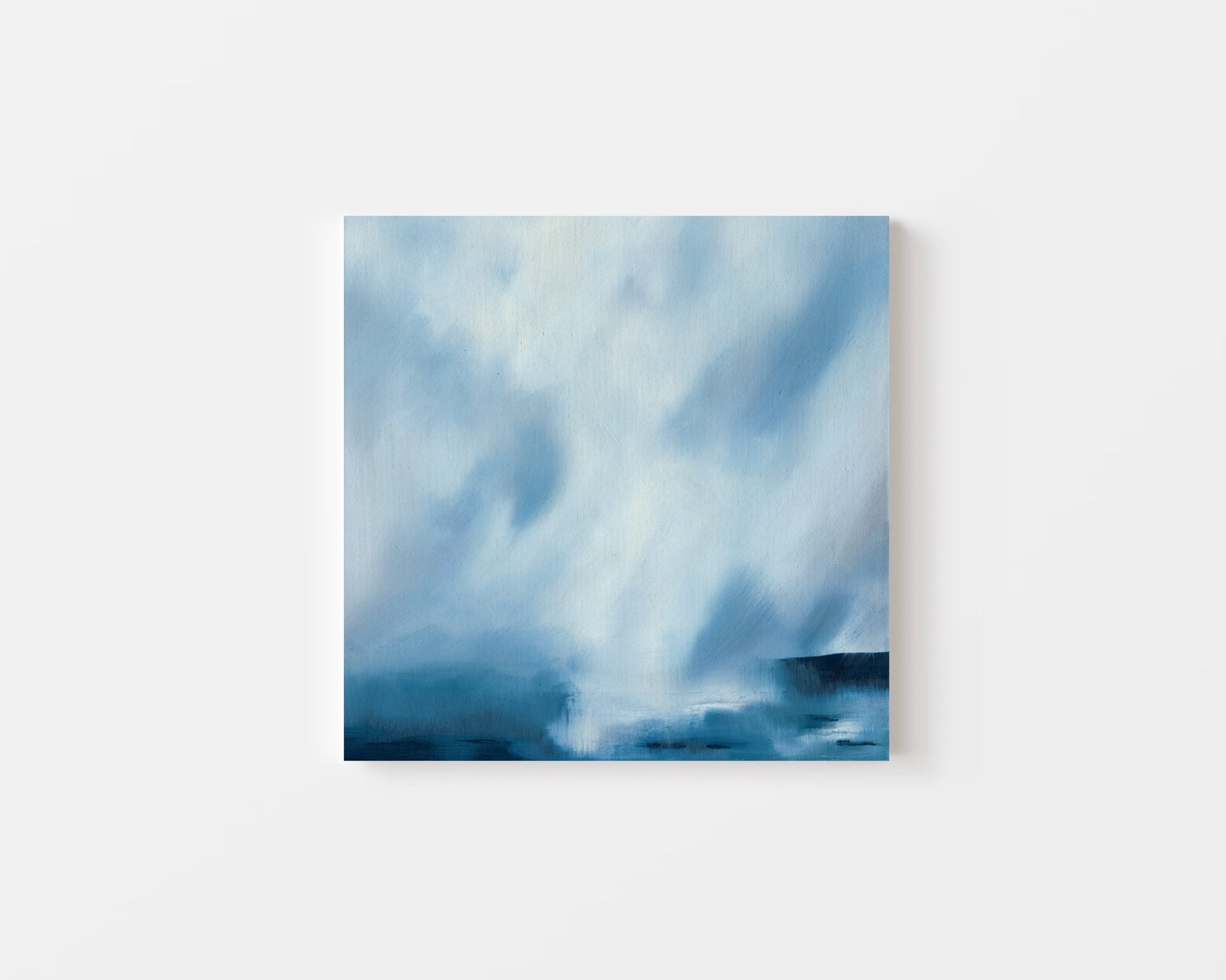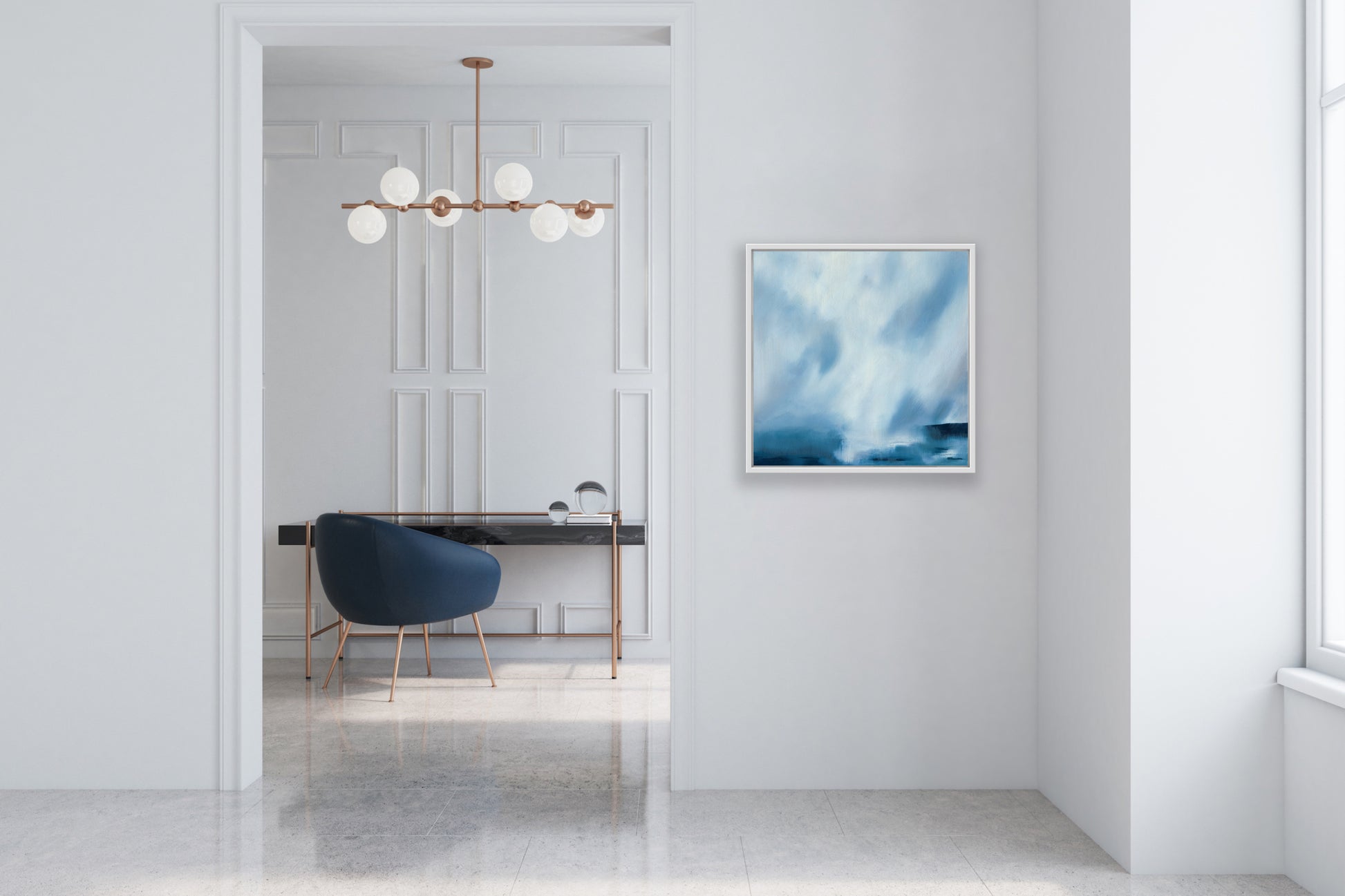 Soothing expressive painting in blue. Framed in a simple white wood frame.