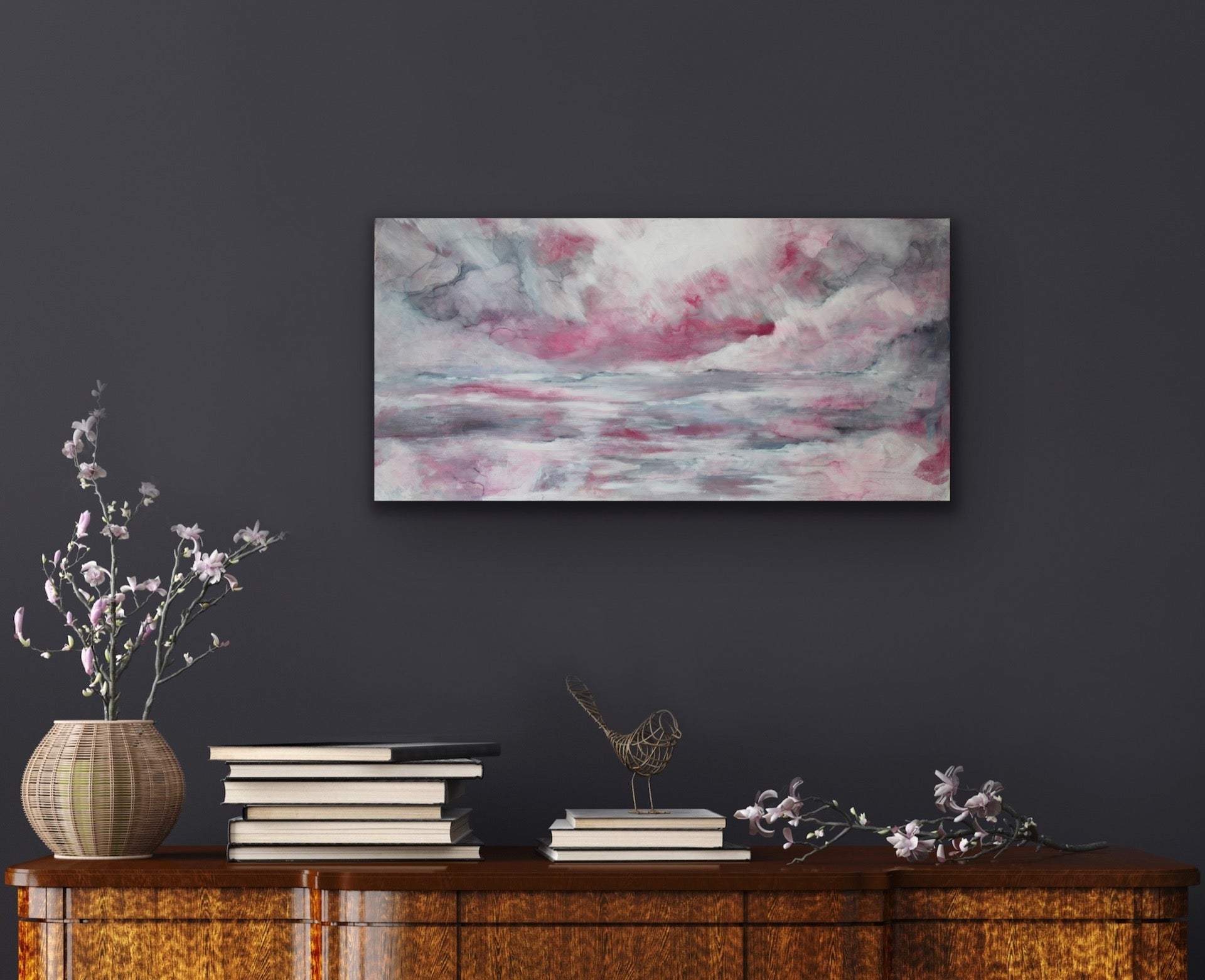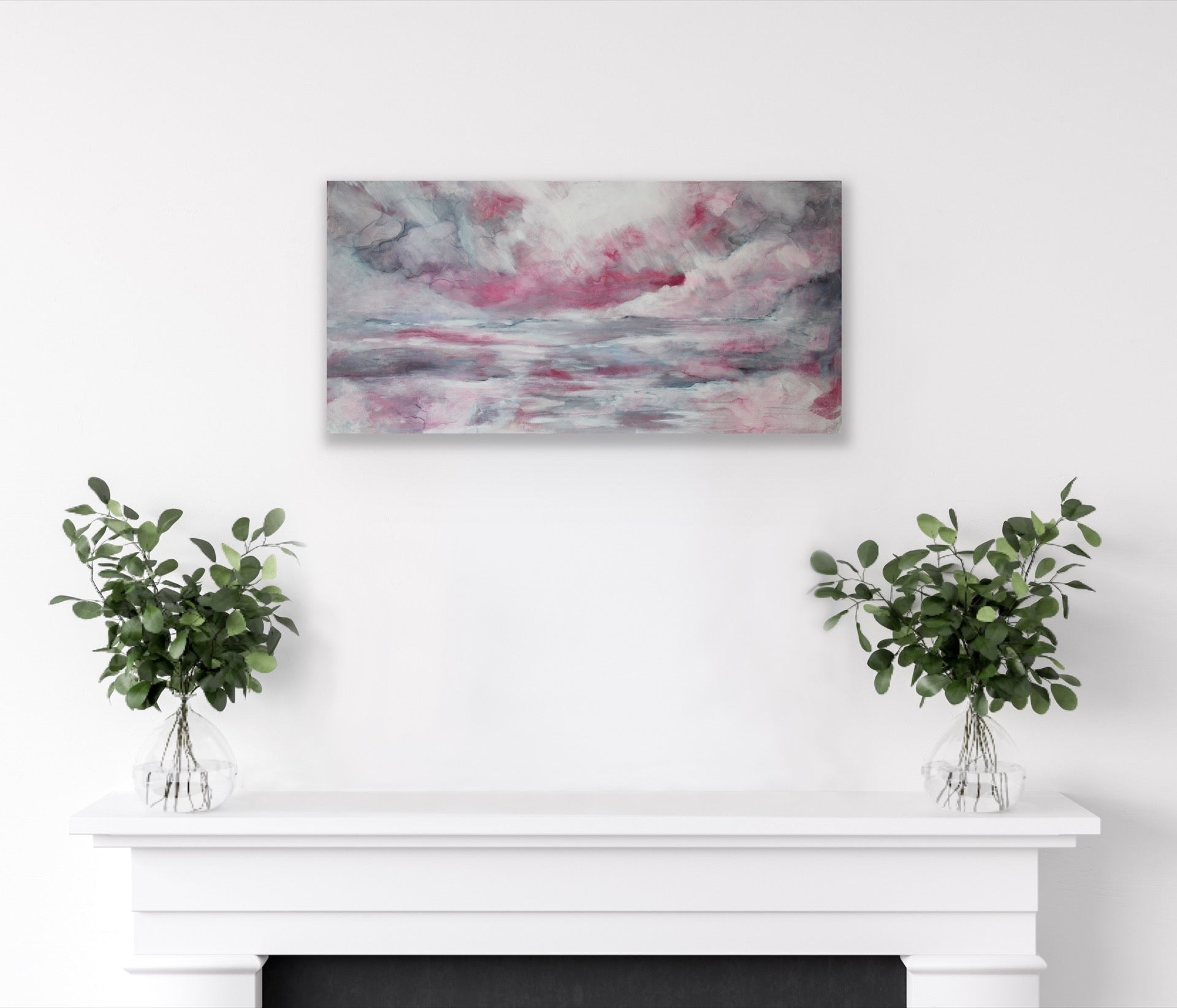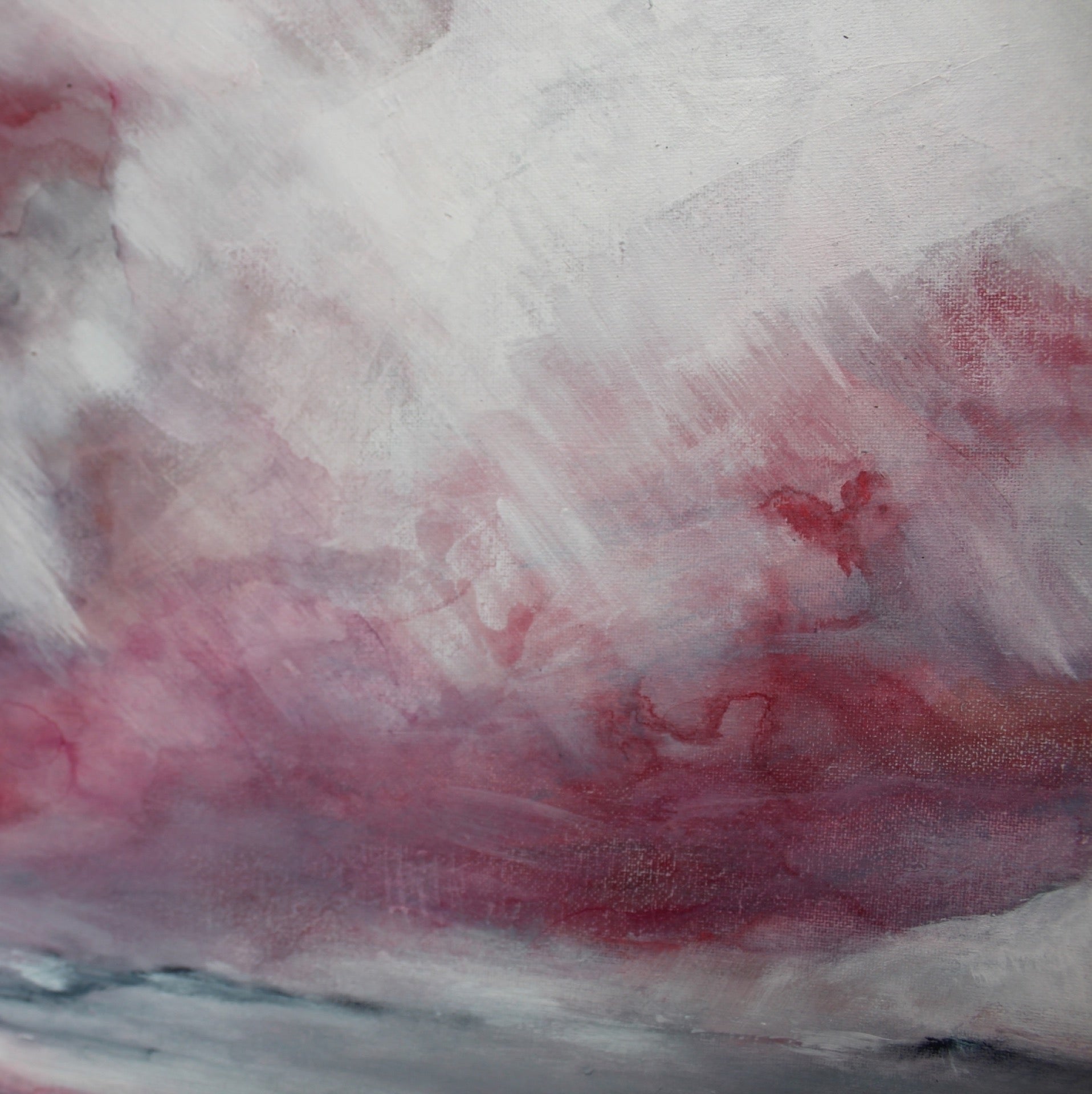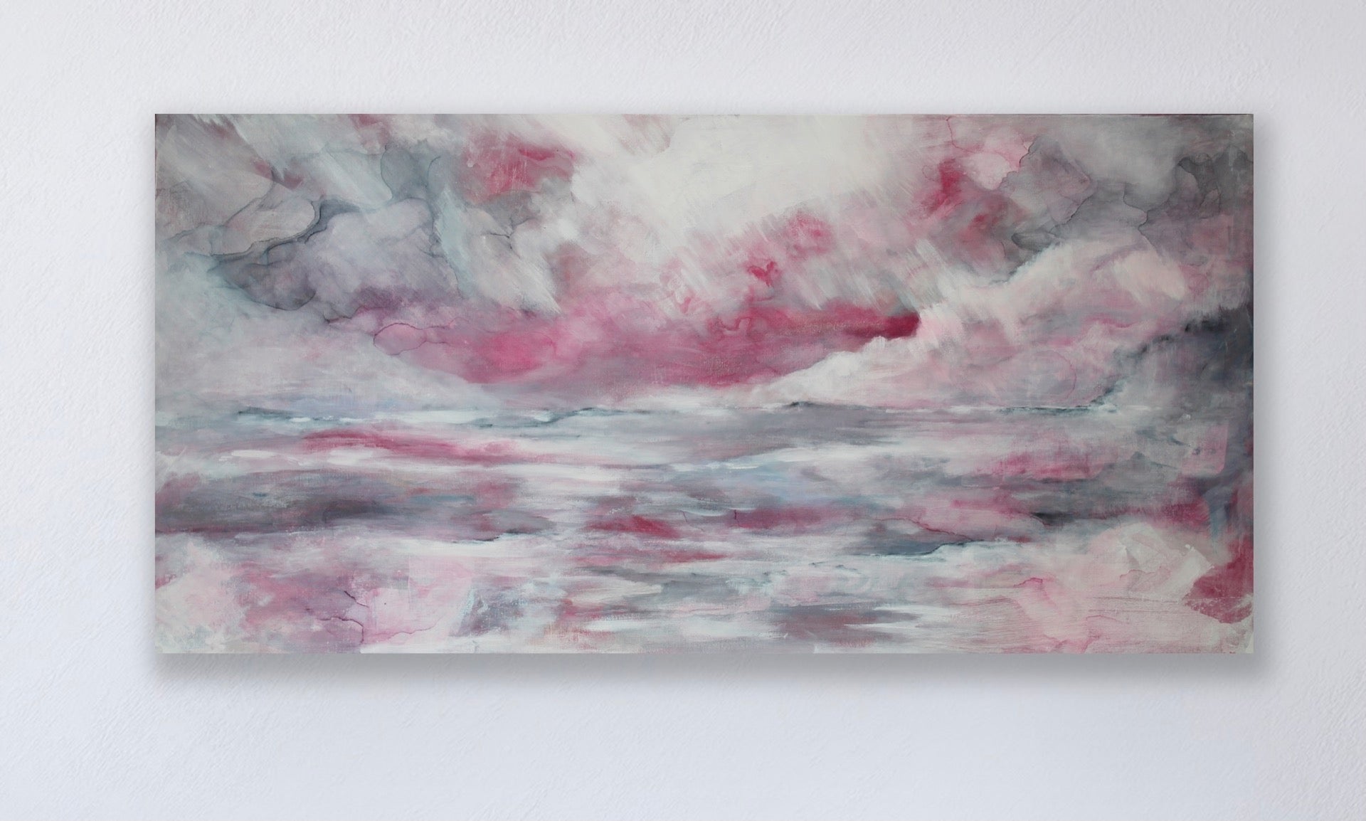 Everything is settling, things are quiet, you can stand looking towards the horizon and feel composed. This painting has been created with shades of pinks and raspberry reds and cooling greys. Layers of watery inks and acrylics as well as powdery pastels to build up layers and interest in the painting.