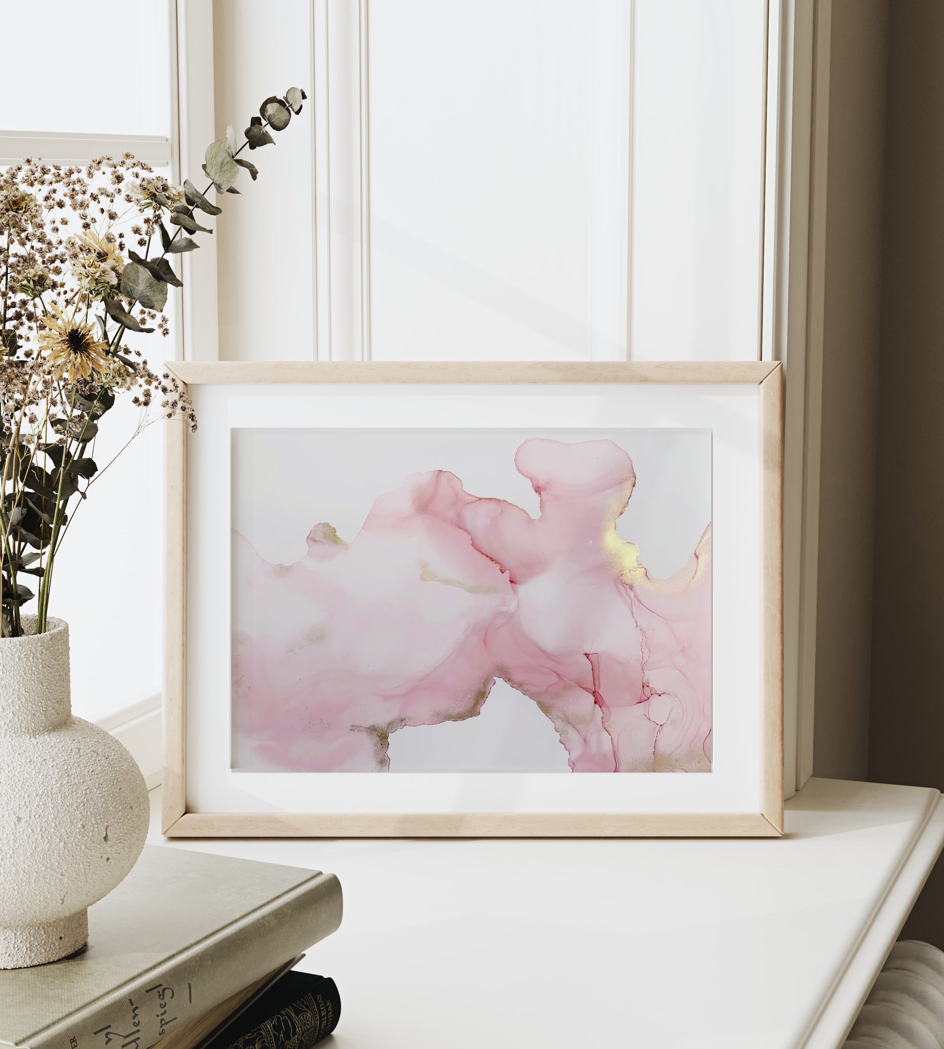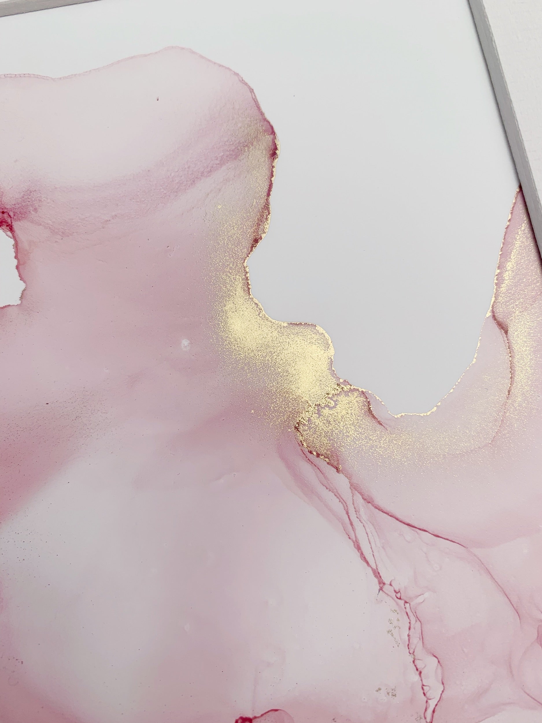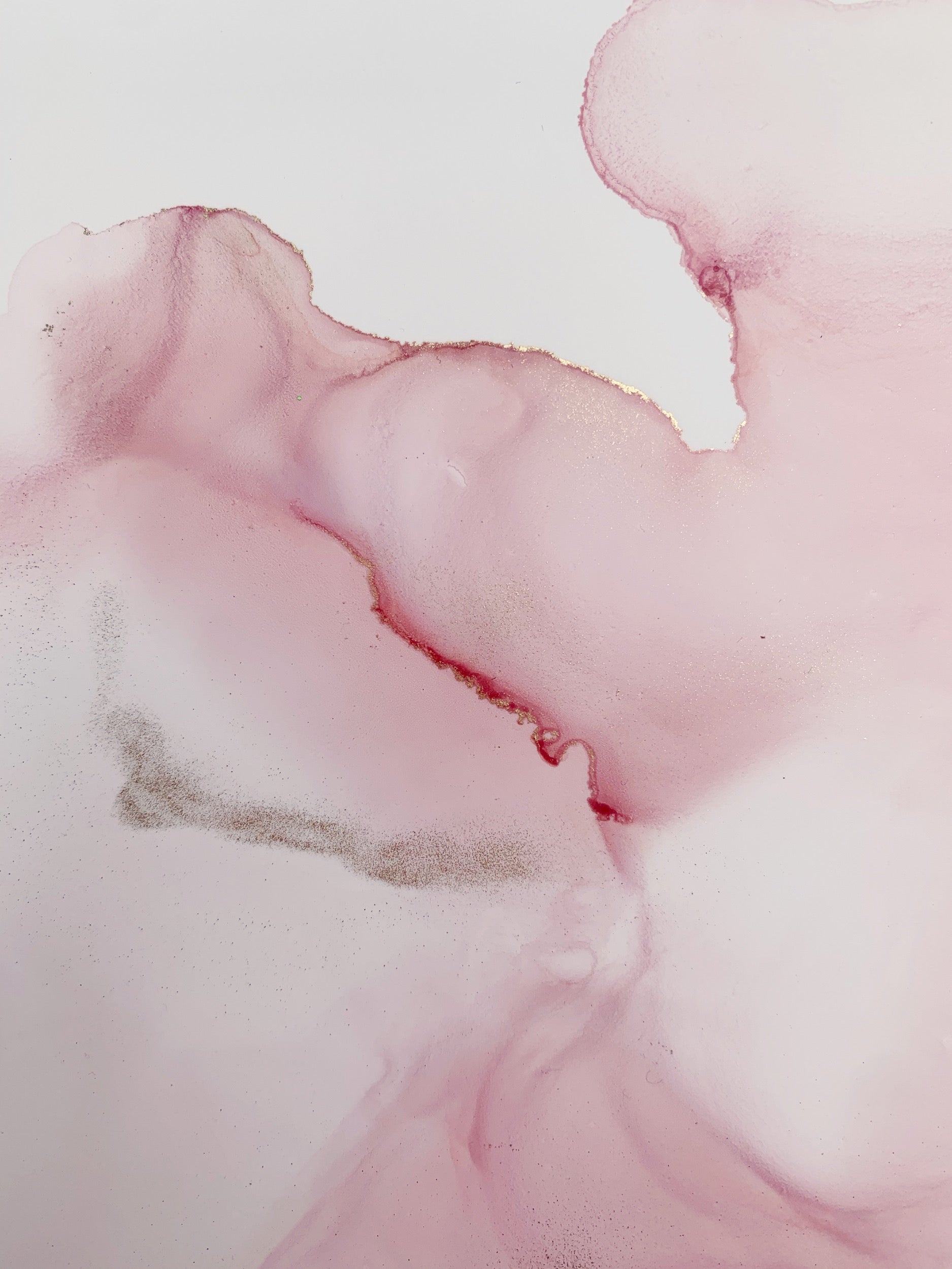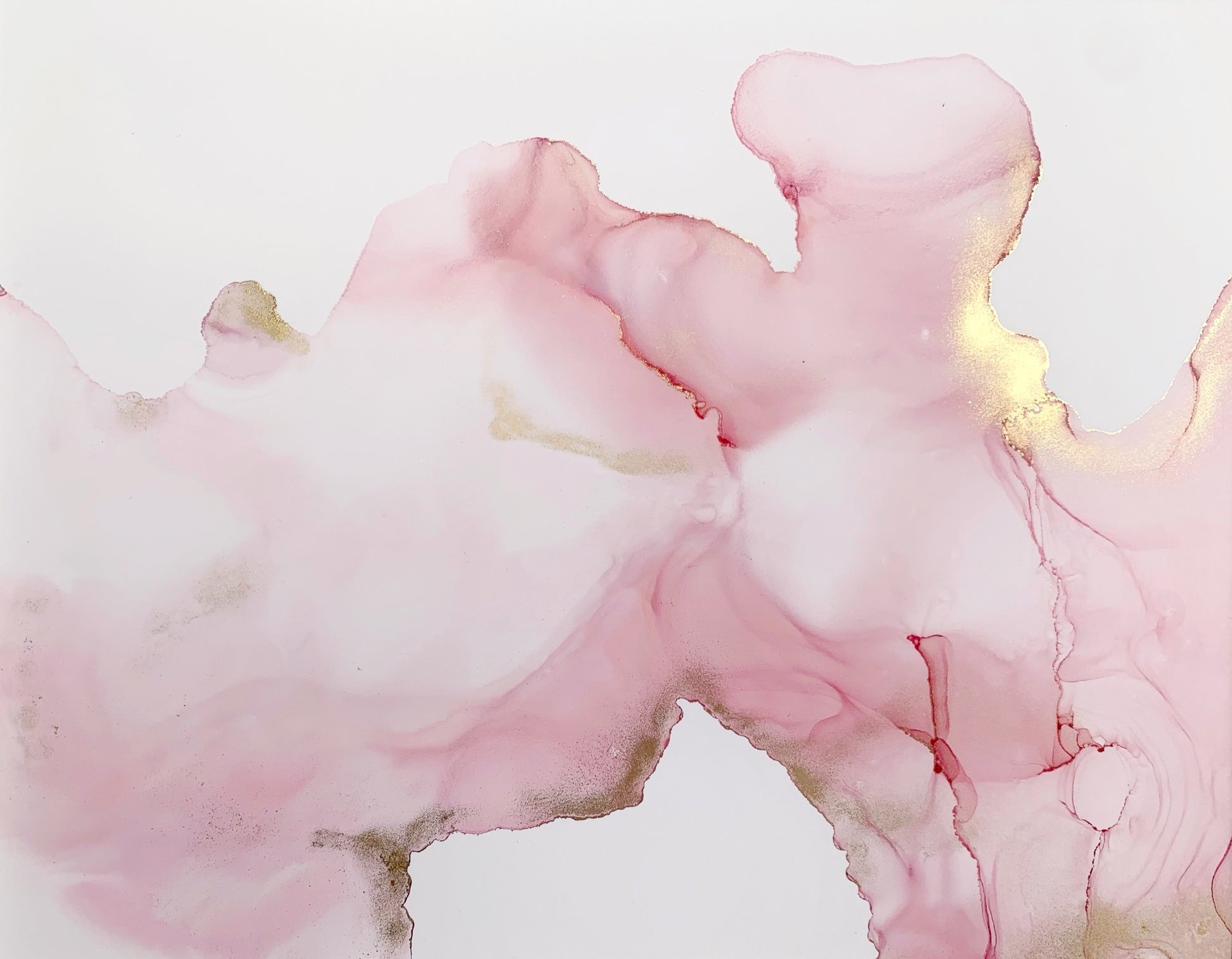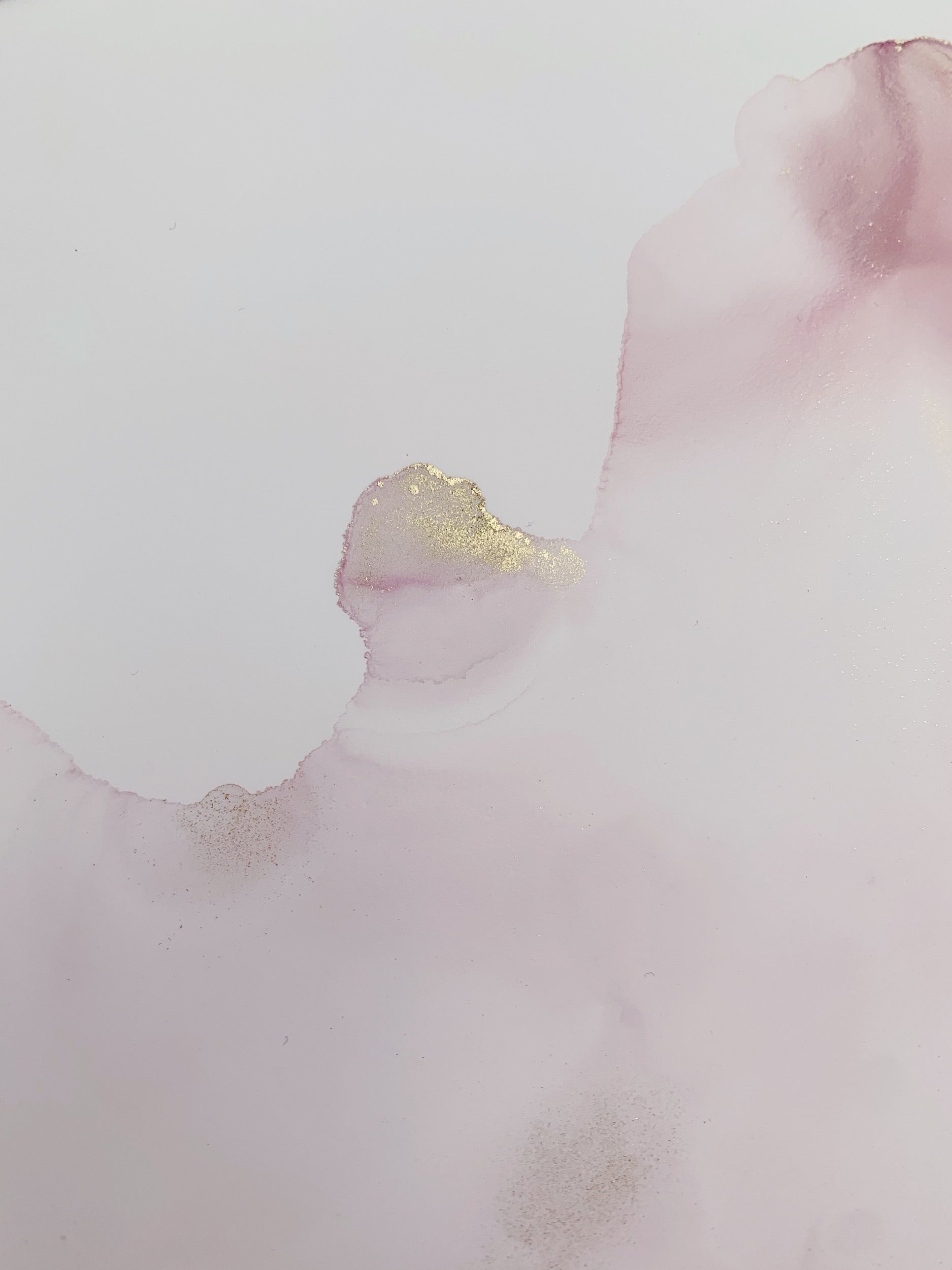 Mixtures of blush and powder pinks. The colours blend across the paper and gold dots weaves its way across.