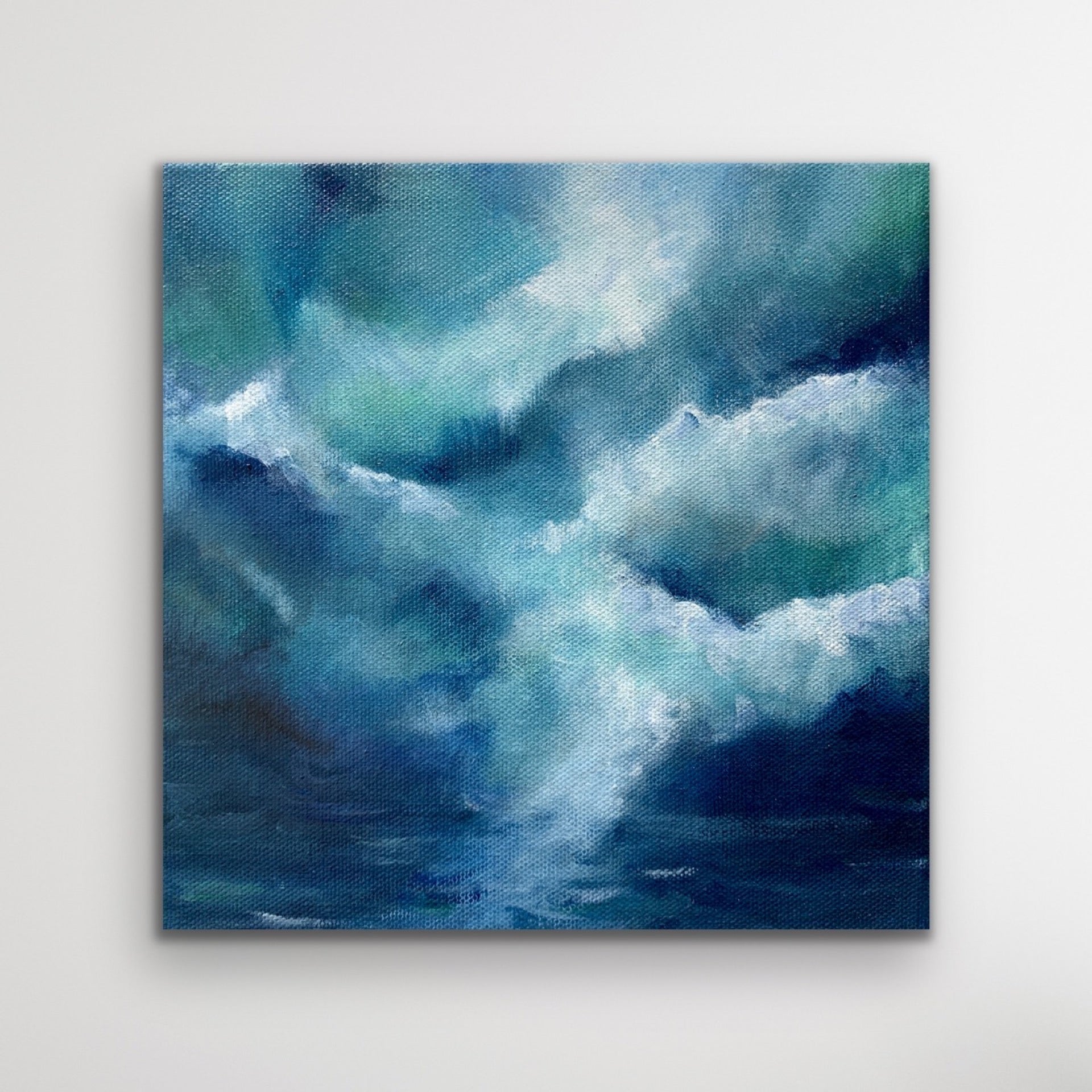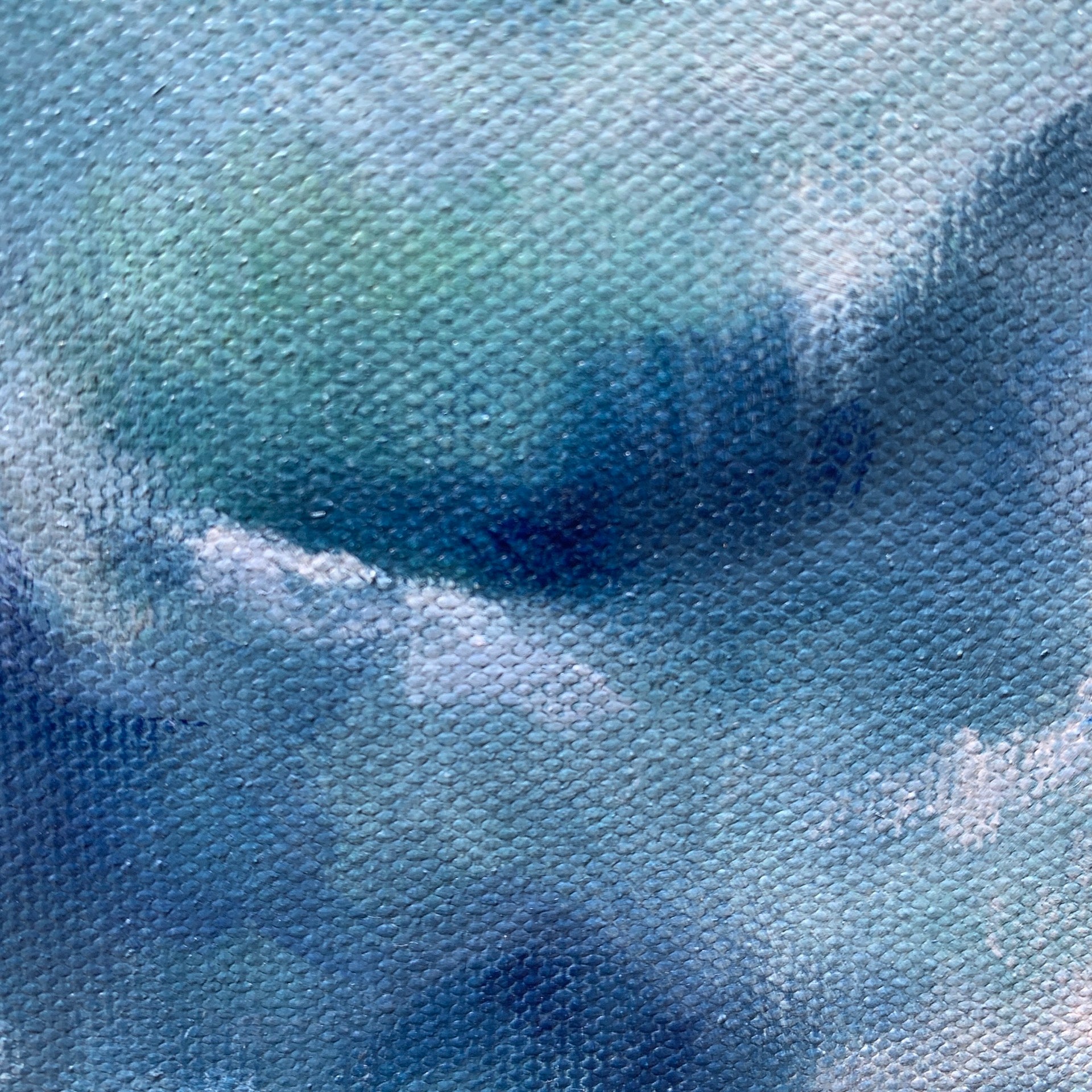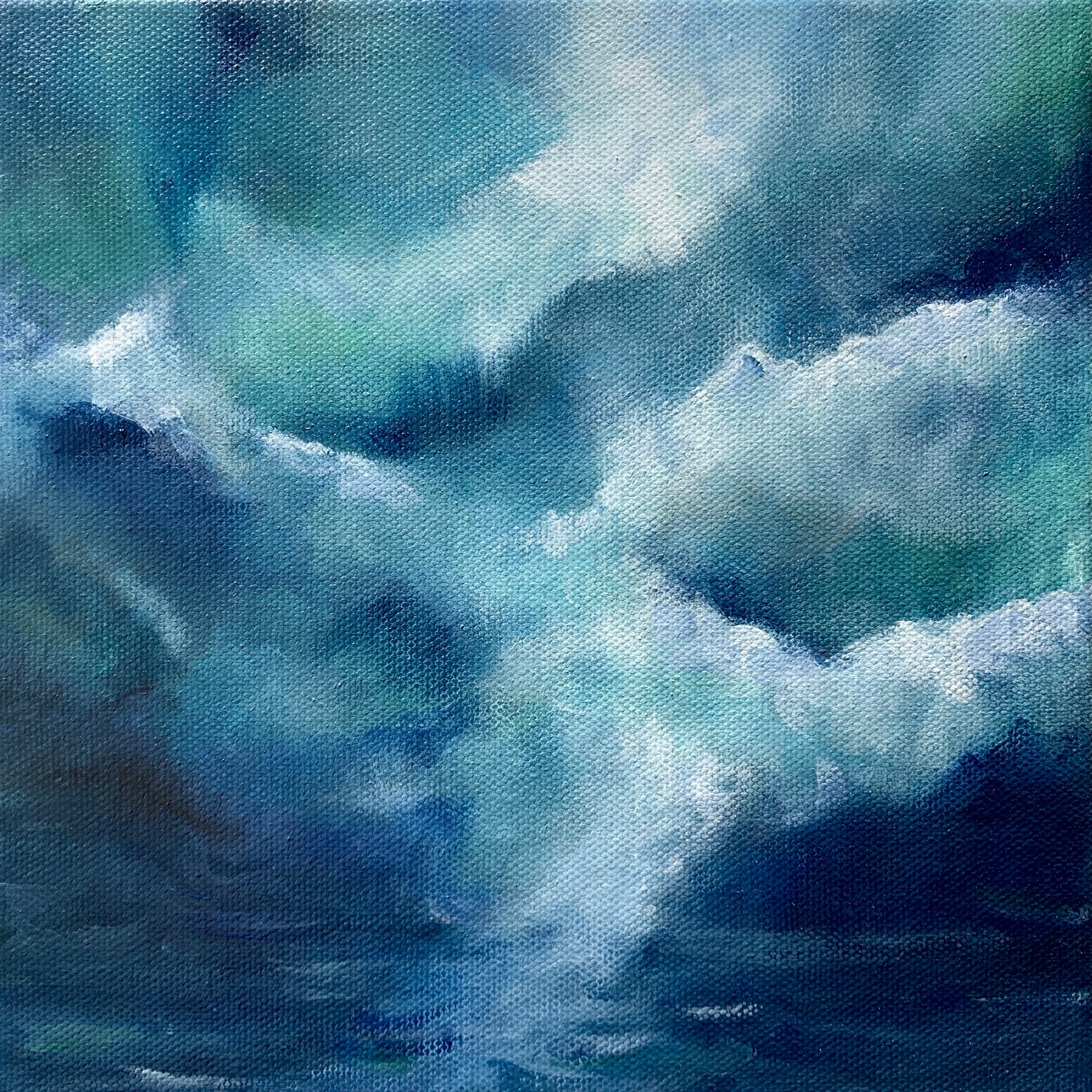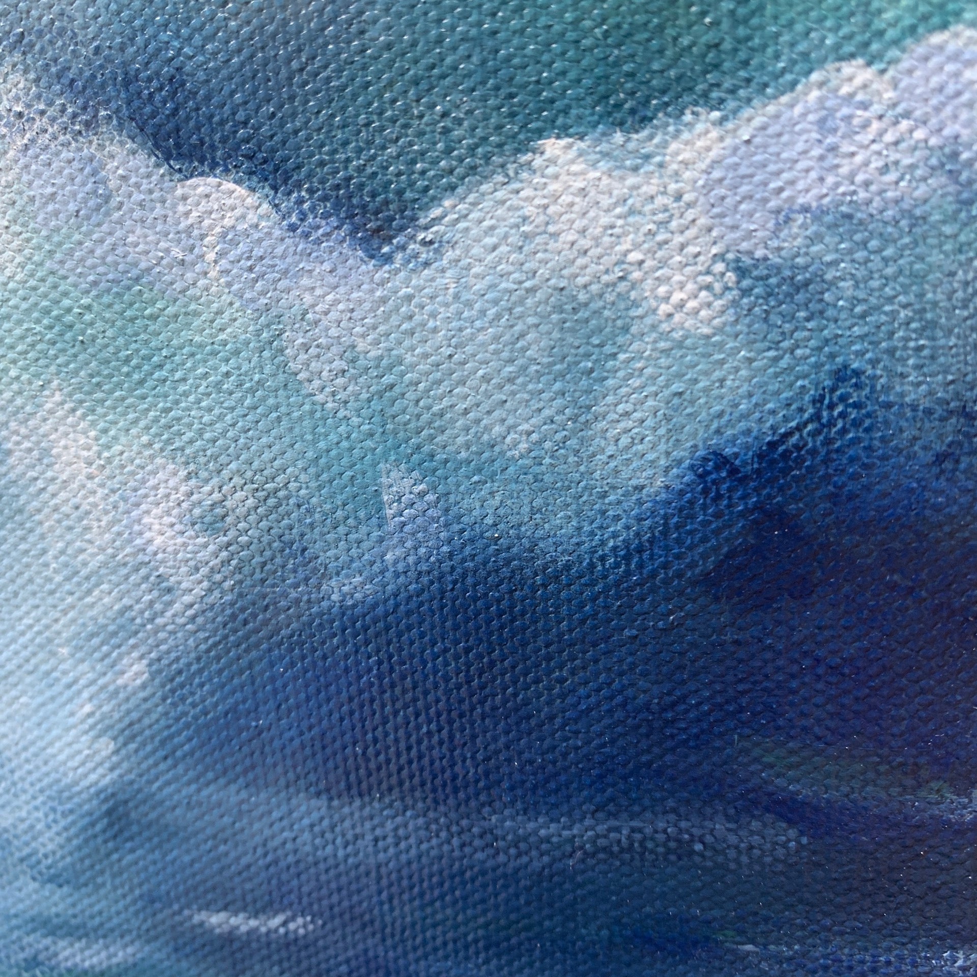 Called Turbulence lightens, it's an atmospheric original abstract painting in acrylic and mixed media. Overlapping turbulent layers lighten and weave their way across the sky.