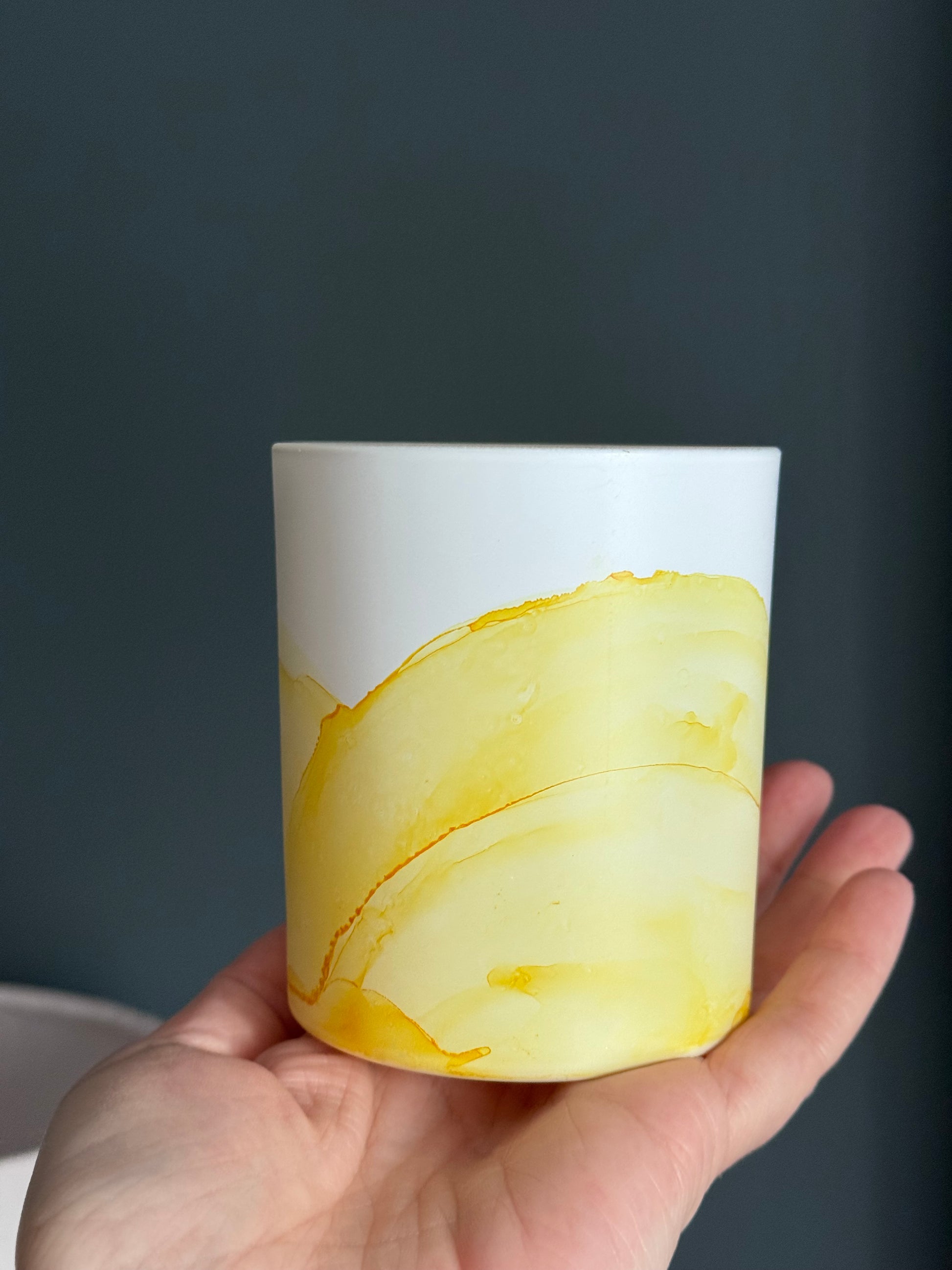 Add a unique touch to your decor with this yellow hand-painted pot, crafted by artist Christina Sadler. Each glass holder features a soothing water-inspired design, layered with care to create a truly one-of-a-kind piece. The luxurious matte finish and weighty feel make it both visually striking and tactilely satisfying.